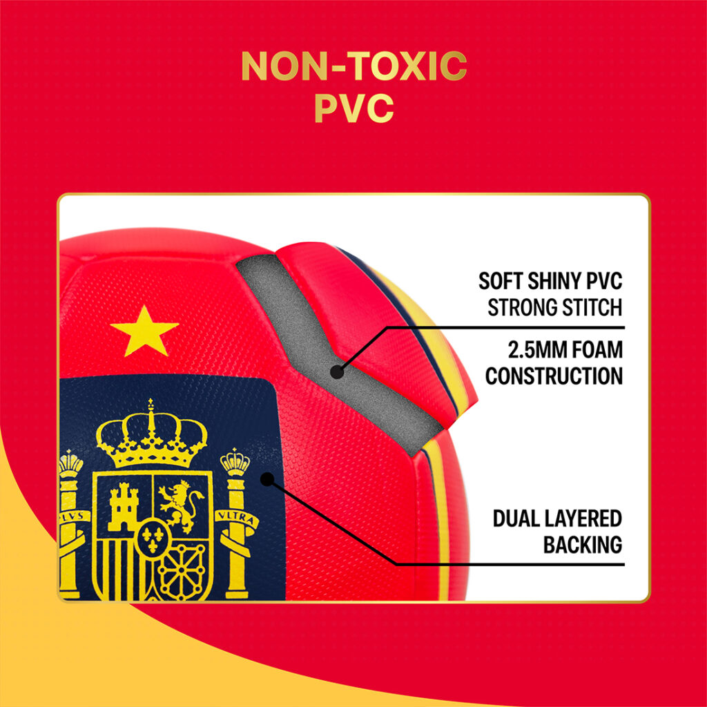 Official licensed Size 5 Regulation Spain Soccer Ball that features dual layer backing over 2.5 mm foam and rubber bladder for rugged play construction, and vibrant printed graphics on high-quality PVC. Pump not included.