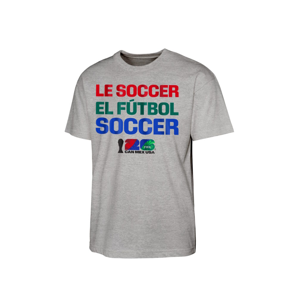 This 2026 FIFA World Cup Grey T-Shirt is made from cotton/polyester jersey with screen printed graphics on the front chest. It features "LE SOCCER EL FUTBOL SOCCER" along with the World Cup 2026 logo on the front.